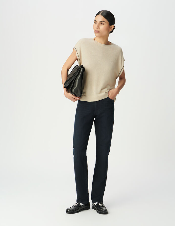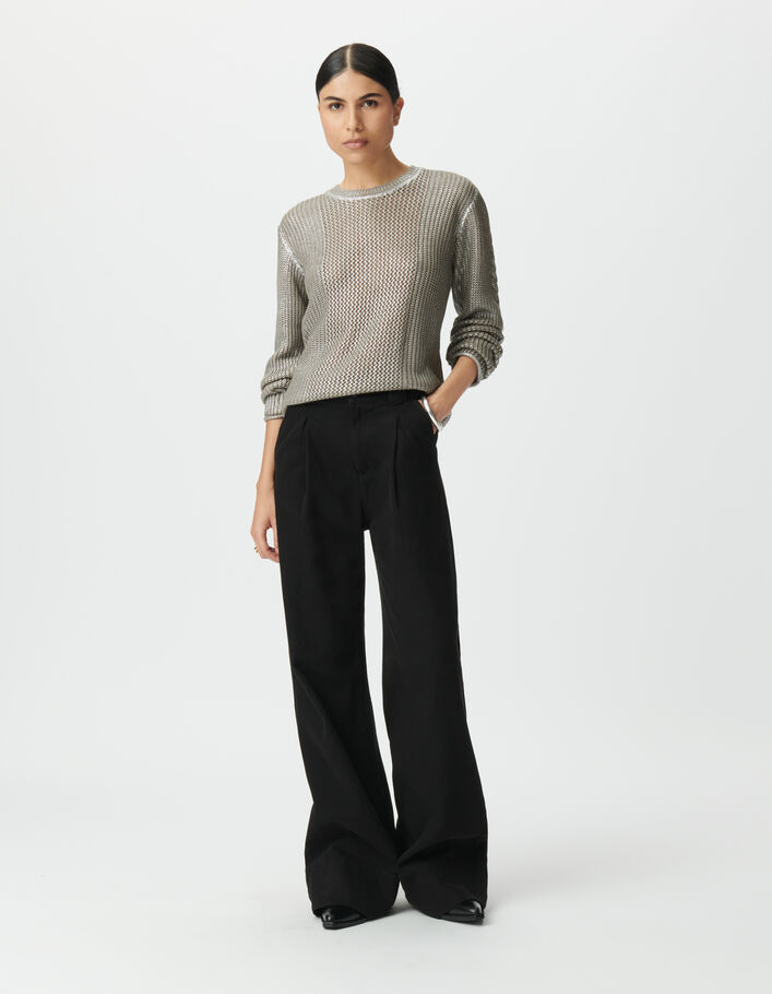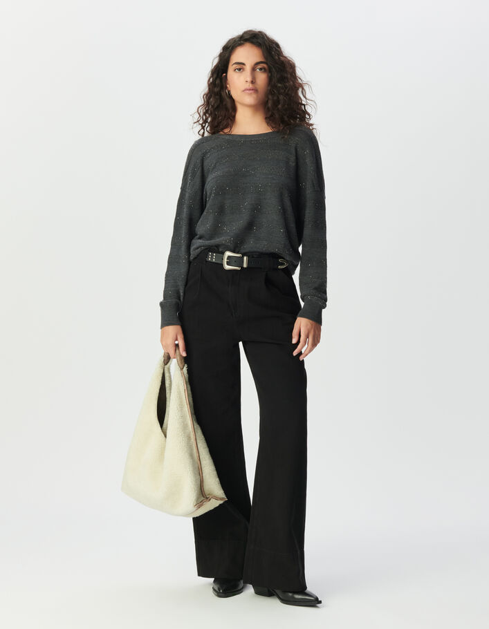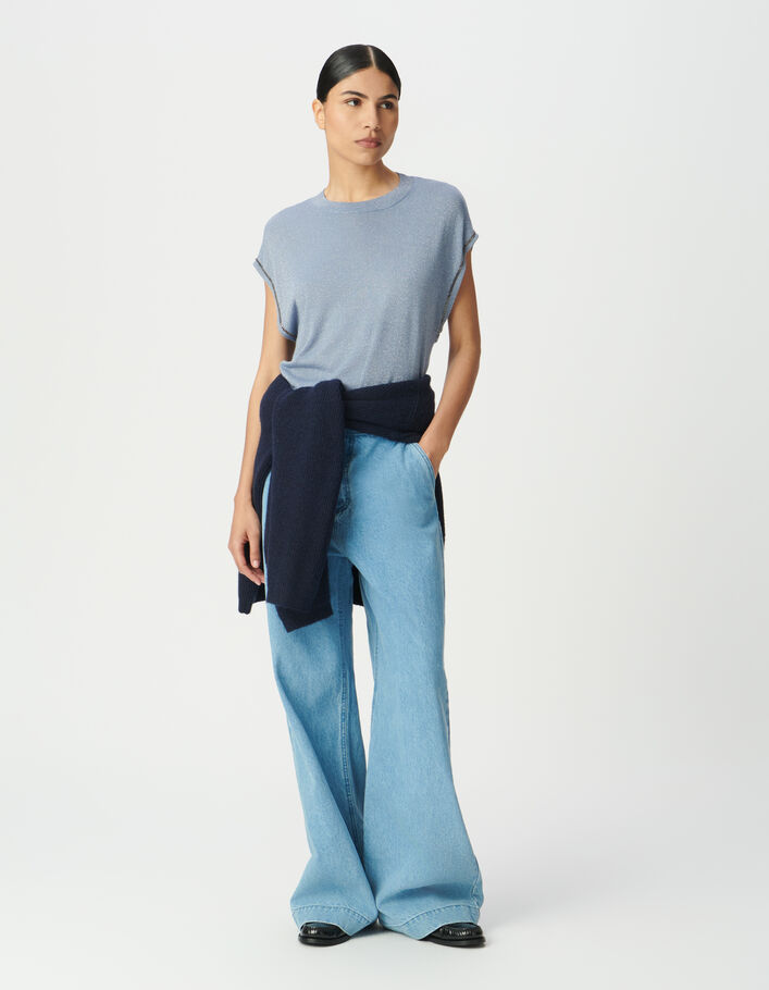 Pull bleu tricot fin lurex décor chaînettes Femme