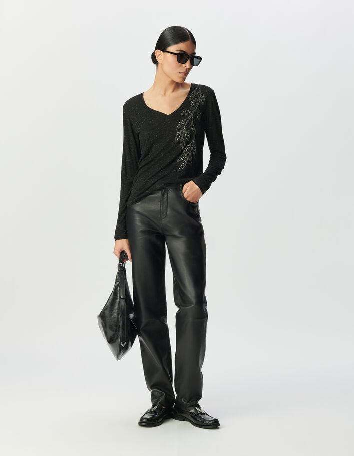 Tee-shirt manches courtes noir encolure V-bijou Femme