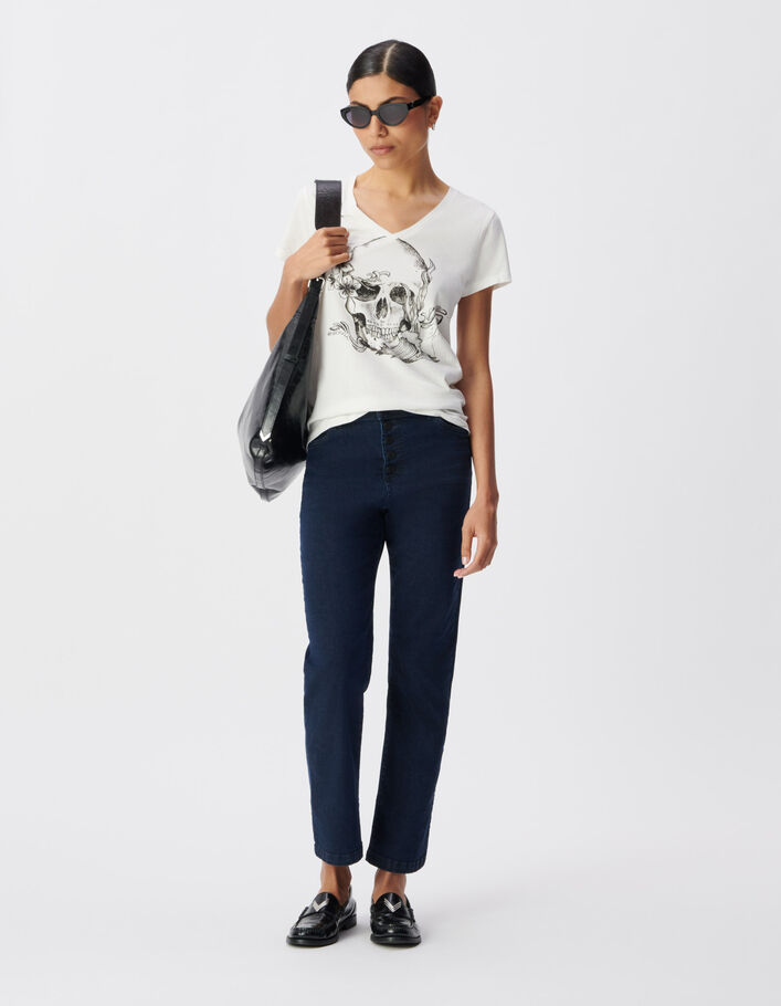 Tee-shirt col V blanc coton bio visuel tête de mort Femme