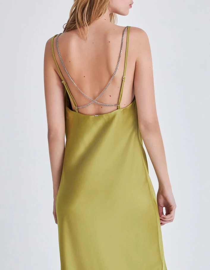 Robe longue verte satinée fines bretelles Femme