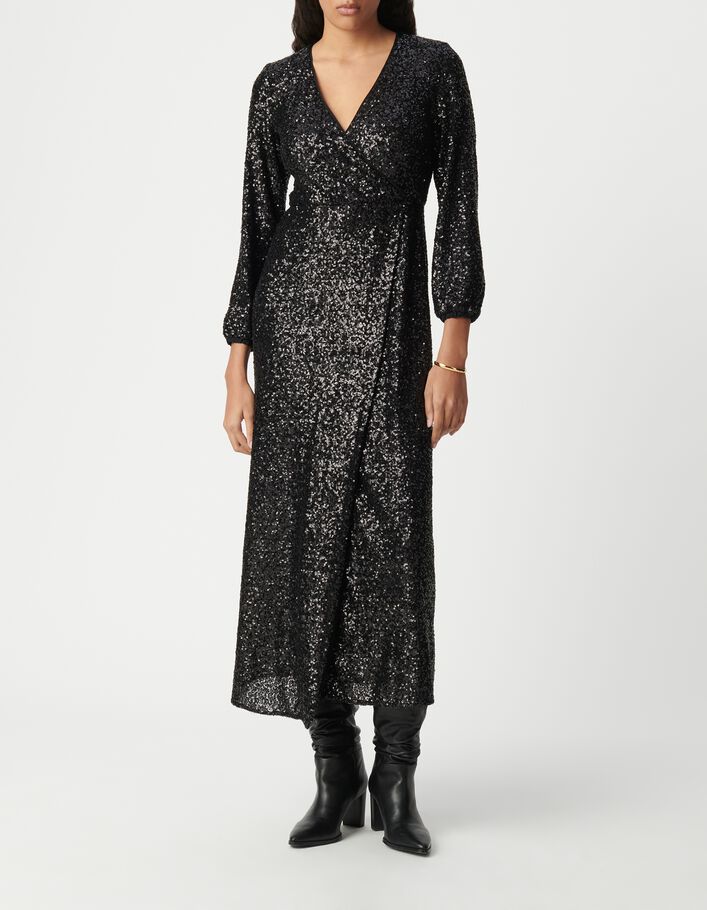 Robe longue noire portefeuille brodée sequins Femme