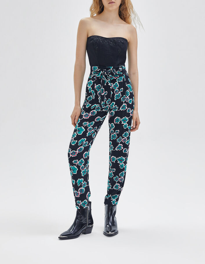 Pantalon fluide noire maxi floral ceinturé Femme