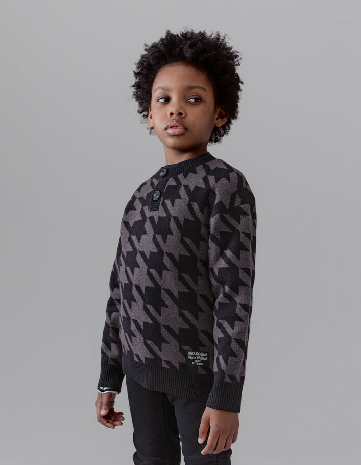 Pull tunisien gris tricot motif pied-de-coq garçon