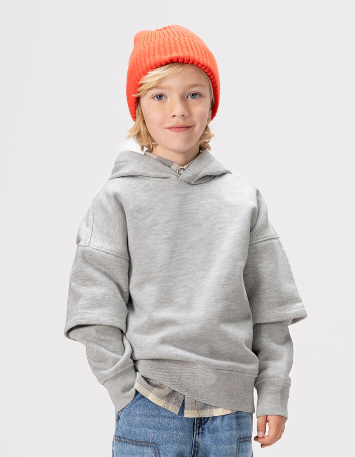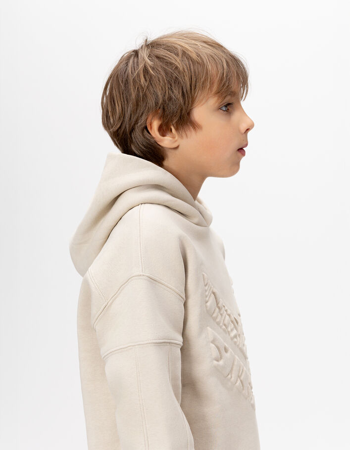 Pull à capuche beige tricot chiné badge chiffre garçon
