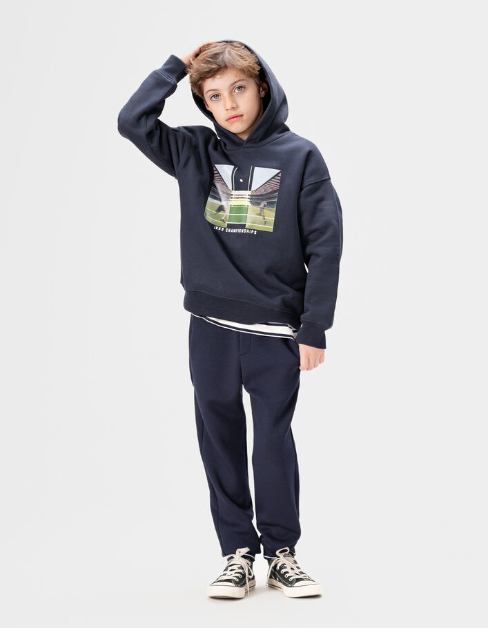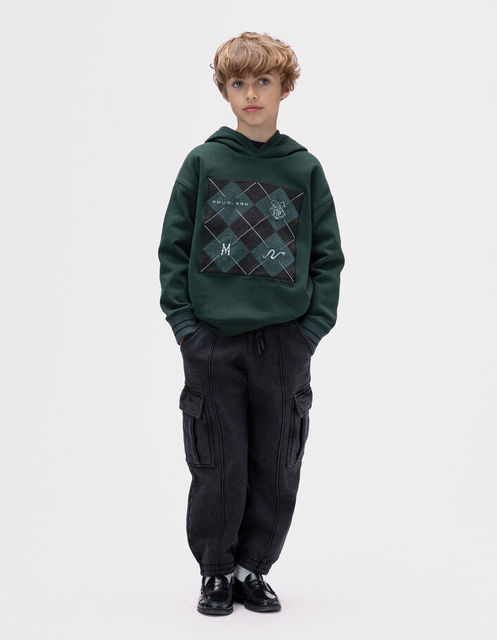 Pull à capuche noir tricot chiné badge chiffre garçon